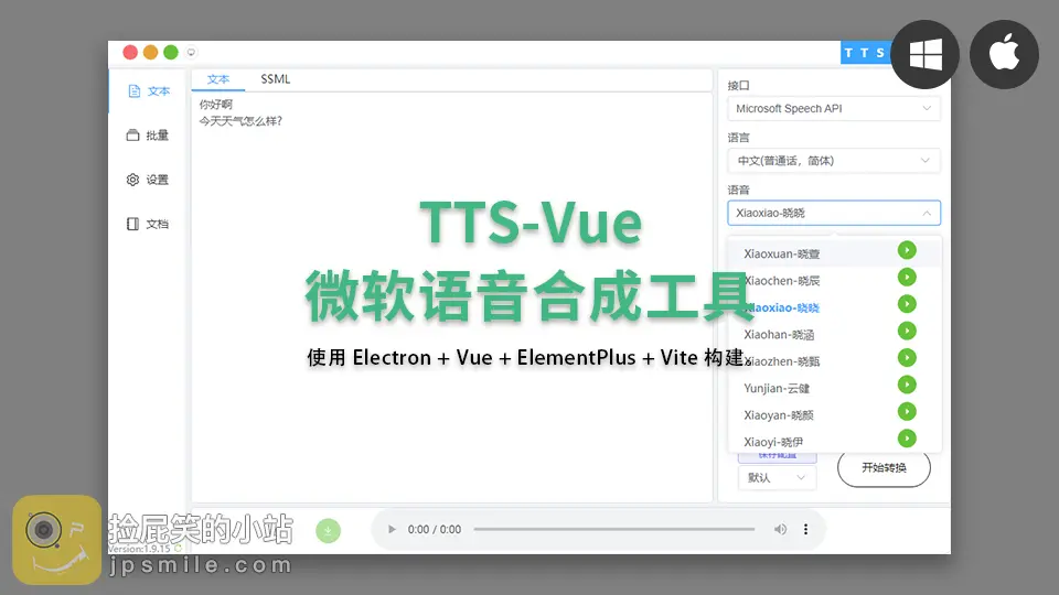 TTS-Vue是一款微软语音合成工具(文字转语音),使用 Electron + Vue + ElementPlus + Vite 构建。